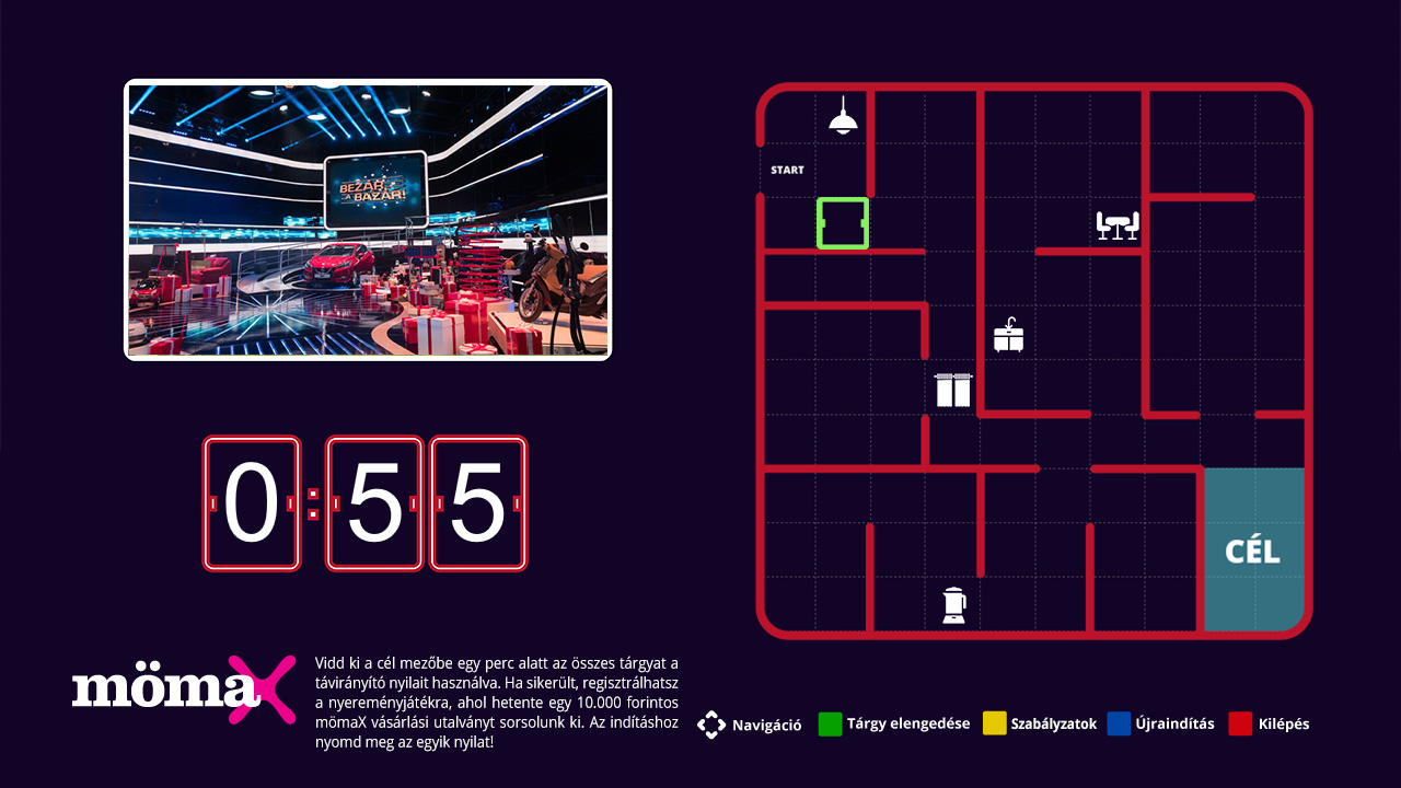 Az interaktív játékban azok vehetnek részt, akik az internetre csatlakoztatott HbbTV-képes tévékészülékkel rendelkeznek, továbbá igénybe veszik az ingyenes földfelszíni mindigTV szolgáltatást vagy a mindigTV PRÉMIUM előfizetői. Akinél a feltételek adottak, a Bezár a bazár műsor ideje alatt a TV2 csatornára kapcsoláskor egy, a játék elérhetőségével kapcsolatos felugró szöveggel vagy képpel találkozik. A távirányító piros gombjának megnyomásával osztott képernyőn jelenik meg az interaktív játékfelület. A játékos a tévékészülék távirányítójának gombjai segítségével játszhat; a játék célja, hogy meghatározott idő alatt „kivigye” a tárgyakat egy virtuális helyiségből. A rendelkezésre álló időt egy visszaszámláló óra mutatja. Ha a játékos az összes tárgyat ki tudta vinni, akkor egy következő képernyőre lép át, melyen a telefonszámának megadásával regisztrálni tud a nyereménysorsolásra. A játékosok között hetente egy 10.000,-Ft értékű Mömax vásárlási utalvány kerül kisorsolásra. A játék részletes szabályzata az alábbi címen érhető el: