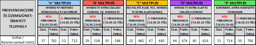 A frekvenciacseréket követően Siófok körzetében a mindigTV ingyenes csatornái az eddigi 57-es (762 MHz) és 22-es (482 MHz) csatorna helyett az 52-es (722 MHz) és 47-es (682 MHz) csatornán lesznek elérhetők. A mindigTV PRÉMIUM Alap, Családi és Kiegészítő csomagjai pedig a 35-ös (586 MHz), 40-es (626 MHz) és 50-es (706 MHz) csatornákra kerülnek át.