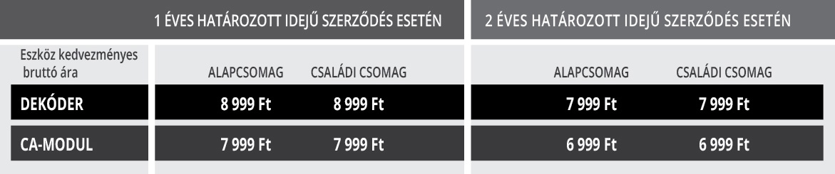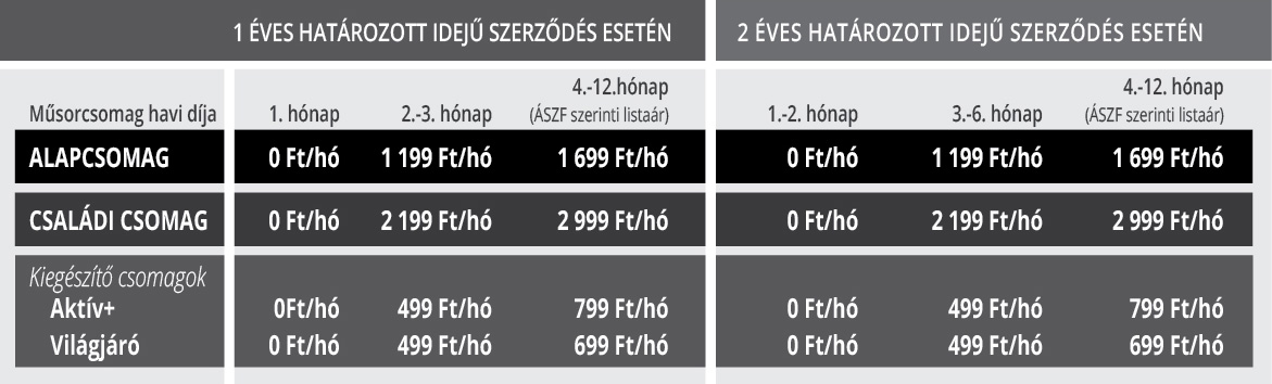 *Az Alap Műsorcsomag havi díja a 12 hónapos határozott idejű szerződések esetében az aktiválástól számított első hónapban, 24 hónapos határozott idejű szerződések esetében az aktiválástól számított első két hónapban 0 Ft. 12 hónapos határozott idejű szerződés esetén a 2-3. hónapokban, 24 hónapos határozott idejű szerződés esetén a 3.-6. hónapokban bruttó 1199 Ft/hó. 12 hónapos szerződésnél a 4. hónaptól, 24 hónapos szerződésnél a 7. hónaptól a hatályos ÁSZF 2. számú mellékletében szereplő listaárat alkalmazza a szolgáltató, mely jelenleg bruttó 1699 Ft/hó. A Családi Műsorcsomag havi díja a 12 hónapos határozott idejű szerződések esetében az aktiválástól számított első hónapban, 24 hónapos határozott idejű szerződések esetében az aktiválástól számított első két hónapban 0 Ft. 12 hónapos határozott idejű szerződés esetén a 2-3. hónapokban, 24 hónapos határozott idejű szerződés esetén a 3.-6. hónapokban bruttó 2199 Ft/hó. 12 hónapos szerződésnél a 4. hónaptól, 24 hónapos szerződésnél a 7. hónaptól a hatályos ÁSZF 2. sz. mellékletében szereplő listaárat alkalmazza a szolgáltató, mely jelenleg bruttó 2999 Ft/hó.