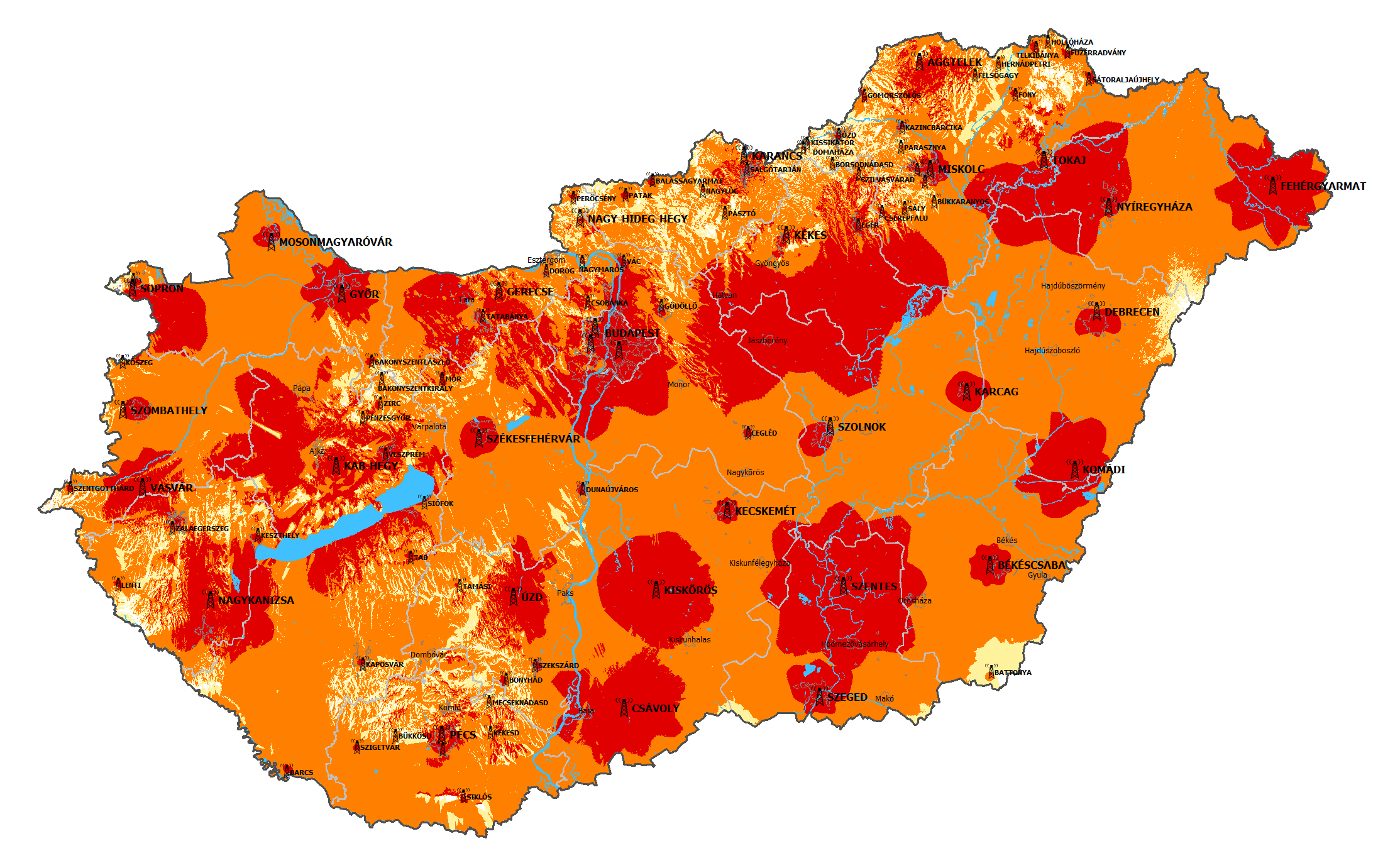 A mellékelt tájékoztató jellegű térképen vétel-előrejelzési számítások alapján színessel jelöltük azokat a területeket, ahol az adókról sugárzott digitális műsorok vétele lehetséges.